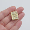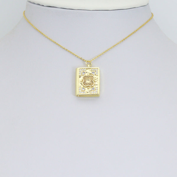 Elegant rectangular gold-tone pendant featuring a center floral medallion surrounded by delicate heart motifs and a pavé border. Its intricate design gives a vintage, royal-inspired look — perfect for layering or statement pieces.