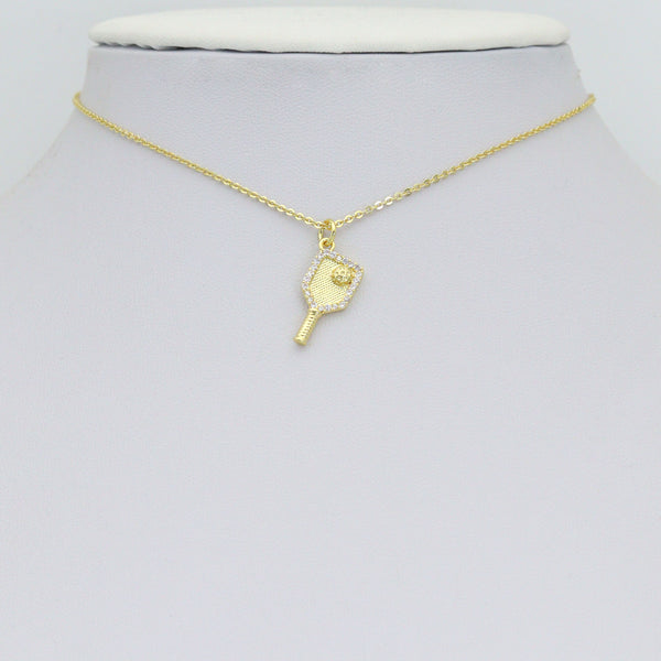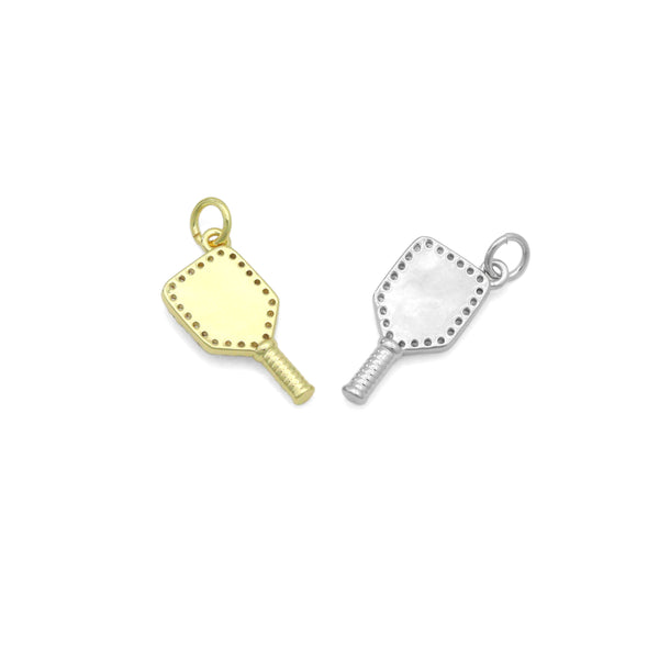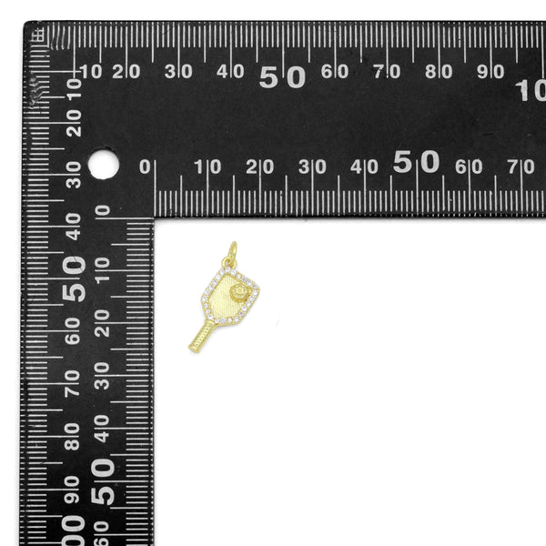 Description: A stylish gold-tone pickleball paddle pendant with a raised ball design and crystal border. Perfect as a pickleball jewelry charm for bracelets or necklaces, or a thoughtful gift for sports lovers.